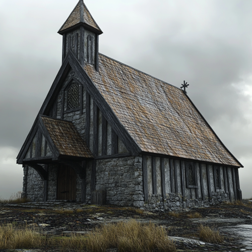 medieval church building, wood and stone structure without christian symbols. Small building belonging to a simple and poor community. Still they try their best to worship their gods. cloudy sky, threatening weather in the background foreshadows danger.
