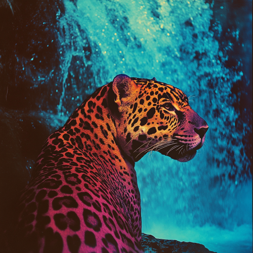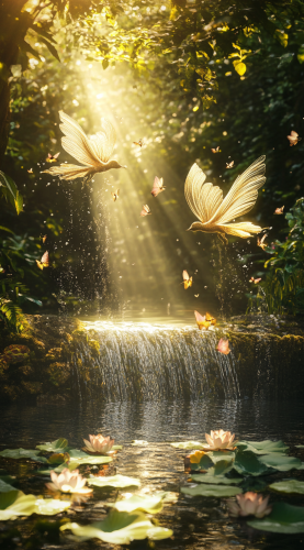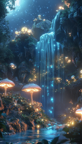 Create a 3D fantasy render of a majestic waterfall cascading from towering cliffs covered in luminescent flora. The waterfall's water glows softly with hues of azure and silver, flowing into a serene pool surrounded by giant mushrooms and exotic plants. Ethereal creatures like fairies or sprites can be seen dancing around the misty spray of the falls. The scene is illuminated by bioluminescent plants and glowing crystals embedded in the rocks. Above, the night sky is adorned with swirling galaxies and shooting stars, adding a celestial touch to the magical atmosphere. Use intricate details and vibrant colors to bring this enchanted landscape to life, emphasizing the contrast between the glowing elements and the dark surroundings. --ar 4:7