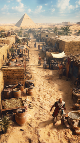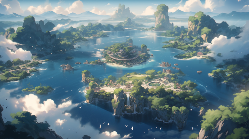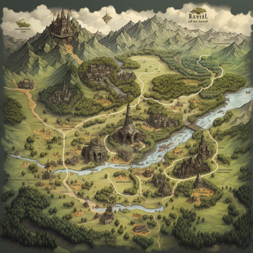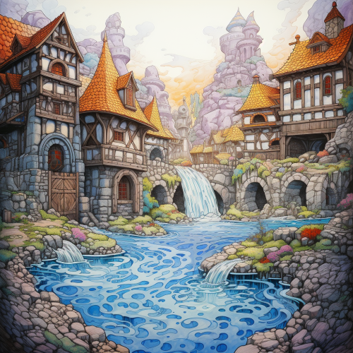 an wide aerial shot of a fantasy world, a scene where an active medieval village borders on overgrown ruins of a technologically advanced civilization; Unreal engine, Blender, handpainted texture --ar 16:9 --s 500 --niji 5