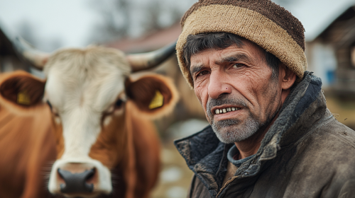 a gypsey romanian man, missing lots of teeths, looking at the viewer. he is standing near a cow in a village in romania. super realistic photo, portrait. Canon EOS R5 II. --ar 16:9