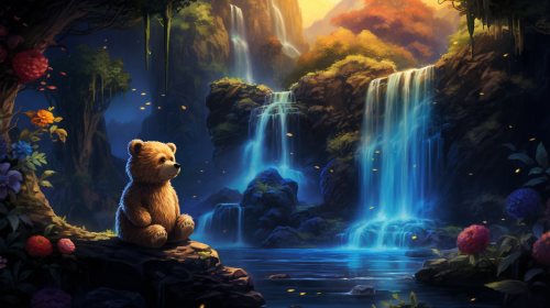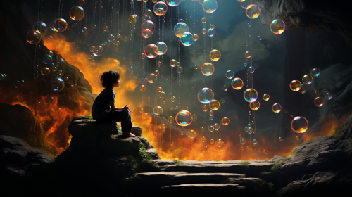 A child playing with a waterfall, side view, atmospheric colorful bubbles --ar 16:9 --v 5.2