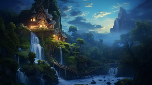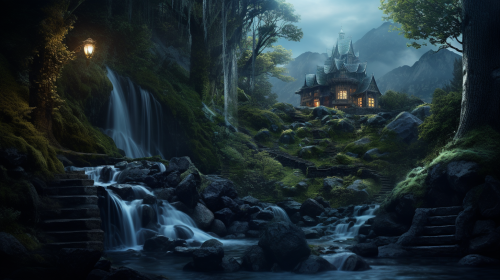 a house on top of a hill with waterfall flowing down the hill in the middle of a magical enchanted forest, night time, HD, 8K --ar 16:9