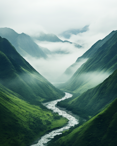 fine art photography, Enchanted Valley, A misty forested valley nestled between towering mountain ridges, High Angle, Kodak Ektar 100, 35mm, Mountain Valley, Cool Tones, Misty Atmosphere, Mountains, Morning, Mystical, Foggy Peaks::1 in the style of David Burdeny::1.5 --no camera --ar 4:5 --style raw --v 5.2