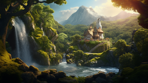 a small house on top of a hill with waterfall flowing down the hill in the middle of a magical enchanted forest, HD, 8K --ar 16:9