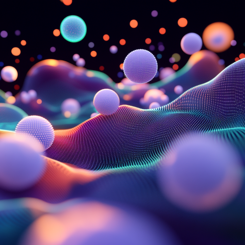 Generate a soft, dreamlike composition of floating balls in varying sizes, featuring few solid gradients of purple, blue, green and light orange. abstract digital landscape made of countless glowing white dots, forming smooth, undulating waves. The balls should appear weightless, with a glowing, ethereal quality as they drift through a blurred, light-filled background. The atmosphere should evoke a sense of calm, serenity, and lightness, with smooth transitions between colors and a slightly futuristic, abstract style. minimalist background photo real, depth of feild. The dots should create a sense of depth and movement, like a futuristic, infinite terrain. The overall atmosphere should feel minimalist yet immersive, with a focus on the contrast between the bright points of light and the deep black background. The scene should evoke a sense of a digital grid, data visualization, or a starry night sky with a modern, high-tech aesthetic.