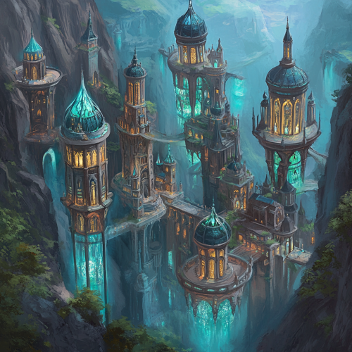 The floating Isle of Learning is the intellectual and magical heart of Ardentia City, a city-state governed by mages. This district serves as a hub of magical education, research, and experimentation, drawing scholars, wizards, and aspiring magi from across the realm. The isle features a blend of traditional arcane architecture with elements of modern design. Ethereal towers, tall and slender spires with glowing runes etched into their surfaces, often built from marble and crystal dot the landscape. Many of these towers serve as classrooms, laboratories, or faculty offices. Several buildings, are enchanted to float a few feet off the ground and are accessed by magical lifts or spiraling staircases. Living Quarters for faculty and students, are constructed from enchanted wood, stone and crystal, often with hidden courtyards, small gardens, or personal magical wards.