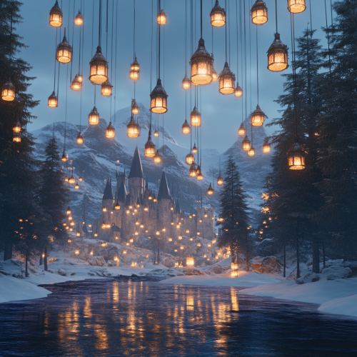 winter themed snowy scene with numerous floating candles above the landscape with high depth, inspired by harry potter and the great hall, art style realistic