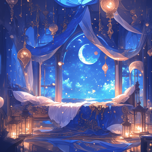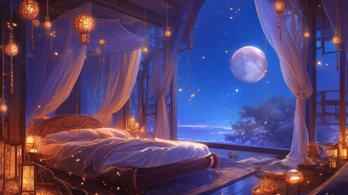 tranquil bedroom, with a canopied bed draped in soft, flowing linens and surrounded by floating lanterns casting gentle glows, walls decorated with delicate tapestries telling stories of a magical world, a window reveals a starlit night sky full of twinkling stars and a soft, silvery moon, composition focuses on the elegance of the bed juxtaposed with the serene window view, the mood is dreamy and comforting, enveloping the viewer in a peaceful embrace, creating a sense of wonder and calm, depicted in enchanting digital art style. --ar 1:1 --niji 6