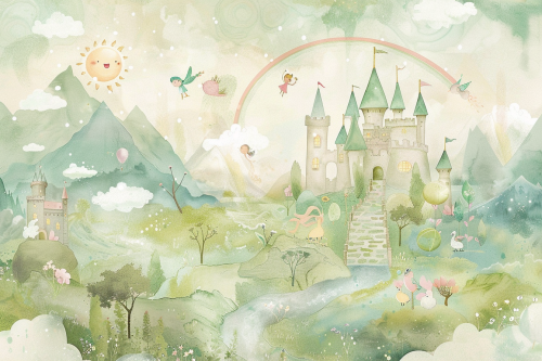A whimsical and dreamy mural featuring a magical castle surrounded by floating islands, playful characters, and soft, pastel-colored landscapes. The scene includes flying children, a smiling sun, and a rainbow arching over the castle, all rendered in a delicate, watercolor style. The background is light and airy, with a mix of greens, blues, and pinks, creating a fantastical and imaginative atmosphere perfect for a child's room. The composition is balanced, evoking a sense of wonder and adventure --ar 3:2 --v 6.0