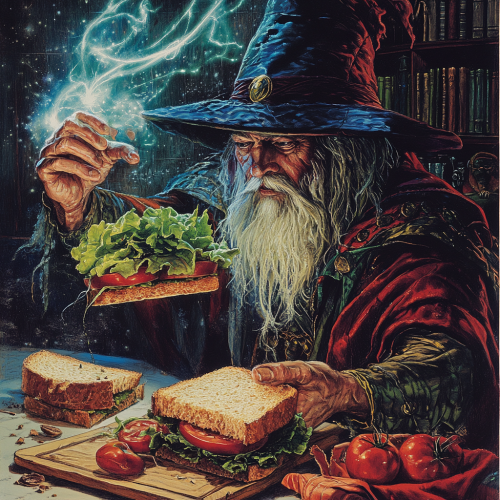 dark fantasy 1970s dungeons and dragons style cover art of a wizard using magic to make ingredients for a sandwich, like lettuce and tomato, float around him. he is directing it towards a piece of bread with his magic