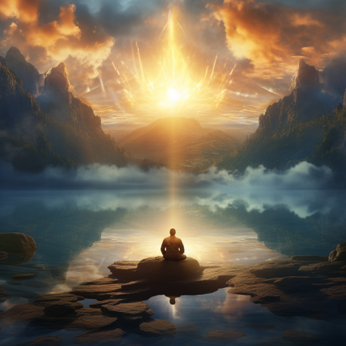 meditation scene with a yogi floating over a magical landscape 16:0 aspect