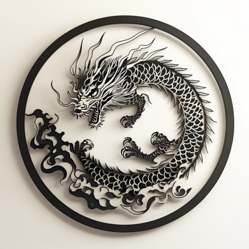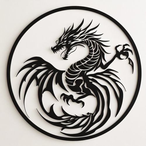 A high-resolution, 2D black and white vector-style metal wall art piece featuring a dragon enclosed within a circular frame. The design includes clean, bold lines and intricate details to depict the majestic and powerful form of the dragon, with sharp claws, detailed scales, and fierce wings. The dragon’s body is elegantly coiled or positioned within the circular frame, emphasizing its mythical and commanding presence. All black areas are solid and continuous without any gradients or shading, resembling a vector logo. The overall aesthetic is bold and striking, capturing the essence of the dragon’s mythical power. The piece is mounted on a plain, light-colored wall, enhancing its contrast and making the details of the dragon stand out within the circular frame.