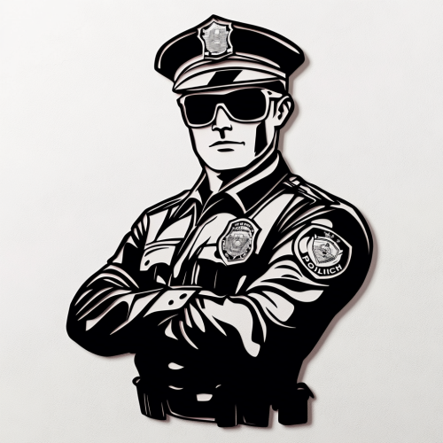 A high-resolution, 2D black and white vector-style metal wall art piece featuring a cool American police officer. The design includes clean, bold lines and intricate details to depict the officer in a confident pose, wearing classic police attire such as sunglasses, a badge, and a uniform, exuding an aura of authority and composure. The officer may be standing with arms crossed or holding a patrol hat, emphasizing the cool and composed demeanor. All black areas are solid and continuous without any gradients or shading, resembling a vector logo. The overall aesthetic is bold and sharp, capturing the essence of professionalism and confidence in law enforcement. The piece is mounted on a plain, light-colored wall, enhancing its contrast and making the details of the police officer stand out.
