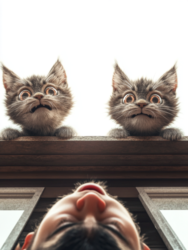 High-definition photo from the perspective of two exaggerated, comic-style cats on the edge of a house roof, looking down at a surprised human lying on the ground below, as if they just fell off a ladder. The human should look comically stunned or confused, with their limbs sprawled in a funny way. The background should be a white backdrop with no shadows, and the cats' ears or paws might be visible slightly in the foreground to frame the scene. The overall style should be humorous, with realistic yet exaggerated proportions to match the comical style of the front design. --ar 3:4