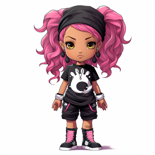vector t shirt art ready to print black and white, graffiti style, full body, chibi, little black girl, pink hairs, white background, 32k resolution, best quality, flat colors, flat lights character sheet, front view, T-pose