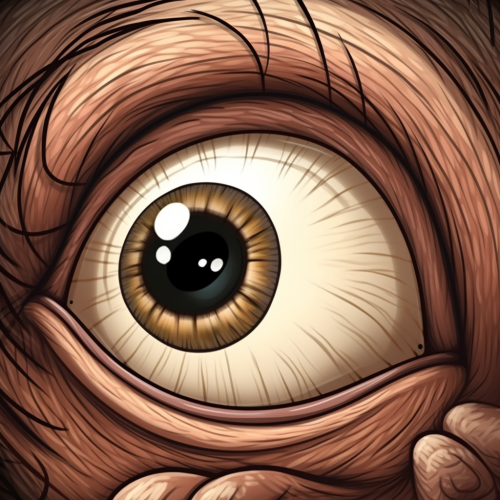 humorous illustration of a tiny cartoon monkey tangled like an eyelash in a human eye, exaggerated and playful expression, detailed close-up --v 5.0 --ar 1:1
