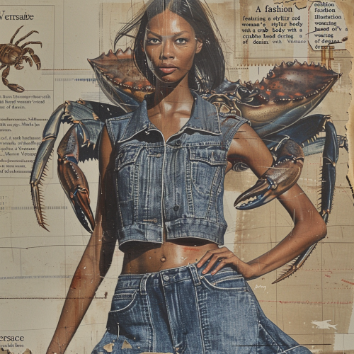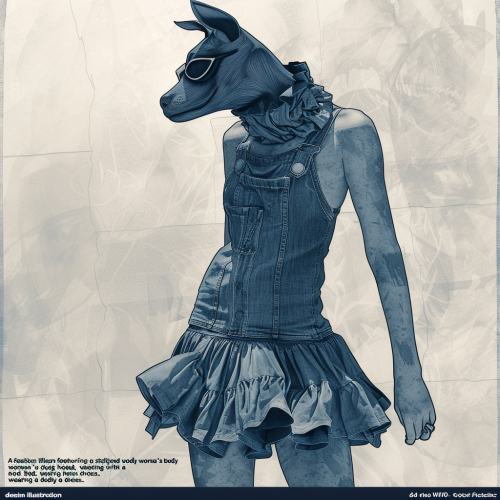 "A fashion illustration featuring a stylized woman's body with a dog head, wearing a denim dress."--ar 4:5