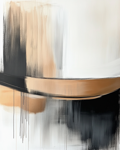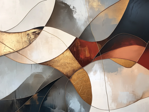 Design an abstract artwork that embodies modern elegance and sophistication. The piece should feature a blend of sleek lines, graceful curves, and dynamic shapes, with a color palette that combines muted tones and rich accents. Integrate subtle metallic elements or textures to enhance the visual depth and refinement. The composition should be bold yet harmonious, offering a unique and memorable aesthetic that stands out in the world of abstract art. Aim for a design that captures a sense of luxury and innovation, ensuring the piece is both eye-catching and elegantly understated --ar 4:5