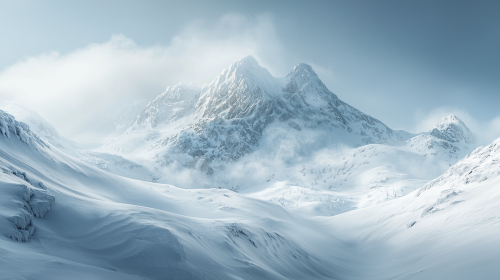 A thick blanket of freshly fallen snow covers a majestic mountain landscape, transforming it into a serene and pristine winter wonderland, silent and cold. --ar 16:9 --quality 2 --v 6.1