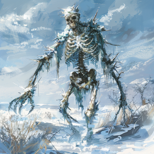 a digital painting of a frozen undead creature, such as a zombie or skeleton, set against a desolate wintry landscape. The creature should appear frozen and decayed, with icy spikes protruding from its limbs and frost covering its bones. The landscape should be barren and snowy, with ice formations and frozen plants adding to the desolate atmosphere. Consider the lighting and color scheme of the scene to create a cold and eerie ambiance. --v 6.0