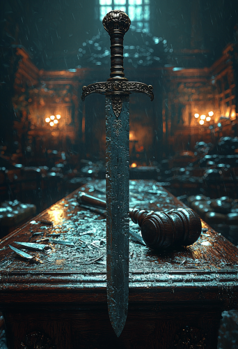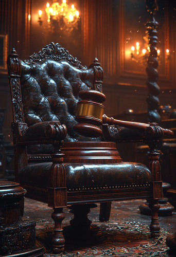 dramatic cinematic book cover, dynamic lighting, hyper-realism, photographic quality, judge's bench of rich warm wood, gavel weapon on top, --ar 13:19 --s 888 --q 2