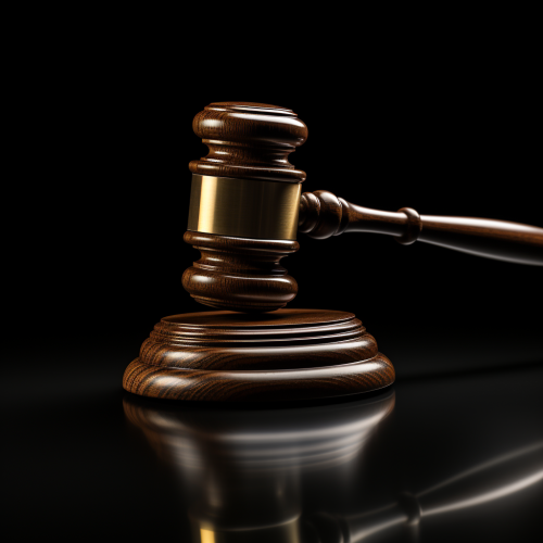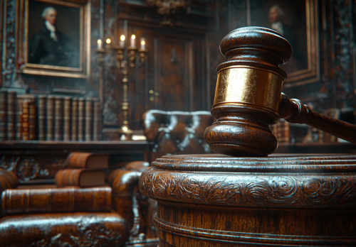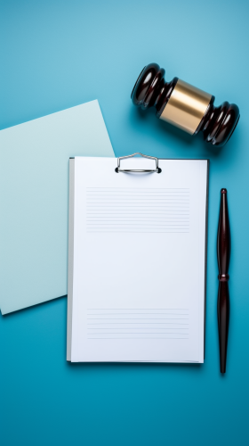 Design a professional and sophisticated visual that represents the legal field. Feature elements such as a gavel, scales of justice, and a stack of legal documents. Incorporate a courtroom or a library with law books in the background. Use a color palette of rich browns, golds, and deep blues to convey authority and tradition. Include subtle details like a judge’s robe, a legal brief, and a courtroom setting with elegant columns and a polished floor. The overall design should evoke a sense of integrity, professionalism, and the structured nature of legal proceedings.