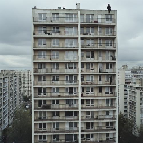  Image photoréaliste UHD. En premier plan sur les 2/3 de l’image, un homme pas très content et se tenant droit semble enfoncé jusqu’aux genoux par un marteau de juge géant (l’image reprend le modèle d’un clou enfoncé par un marteau). En arrière plan légèrement flouté, un immeuble 7 étages à balcons typique des années 70
