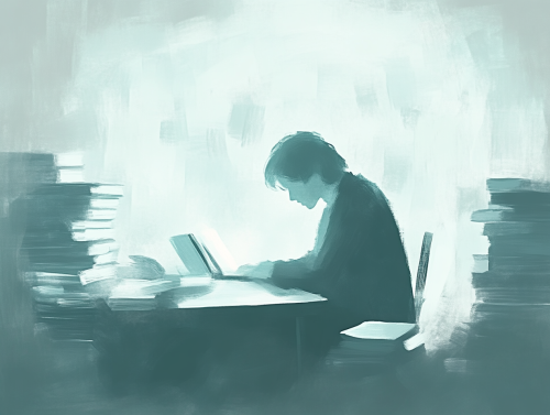 Generate a digital art for A digital art scene showing a person sitting at a desk, surrounded by books and notes, deeply engrossed in preparation. The background should be a soft grey color, symbolizing calmness and focus. The person should appear thoughtful and determined, with a subtle glow around them to signify readiness and confidence. The overall color palette should include shades of grey, white, and light blue to convey a sense of clarity and purpose. --ar 4:3 --quality .5