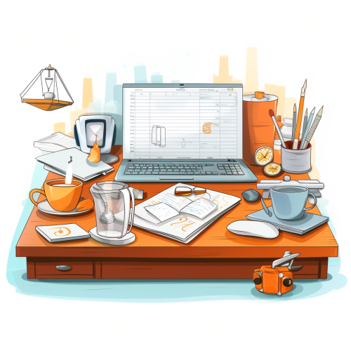 AI Legal Assistant Desk Setting: Personalized office desk. Main Element: Desktop with a chatbot interface, signaling interaction with the AI. Color Palette: Bright whites, uplifting oranges, and comforting blues. Style: Minimalistic, vibrant, and user-friendly. Miscellaneous Elements: Note pads with justice scale doodles, a coffee mug with a gavel design, or mousepads in the shape of legal books. Overall Feel: The ease of having a handy AI legal assistant right at your desk.