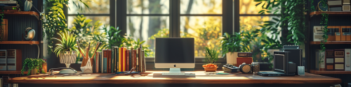 hyperrealistic side view of a businessman's desk, there are books over the table and a profesional micro for podcast, tidy, inspiring, calm --v 6.0 --ar 4:1 --s 250