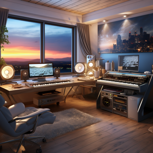 bedroom with music production work desk with calm modern atmosphere and visionary art as decoration