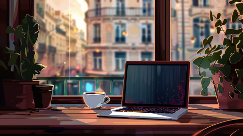 A nice cafe. A laptop working on a desk and a cup of coffee. A simple European city outside the window.:: --aspect 16:9 --version 6.0