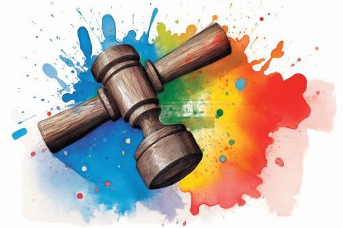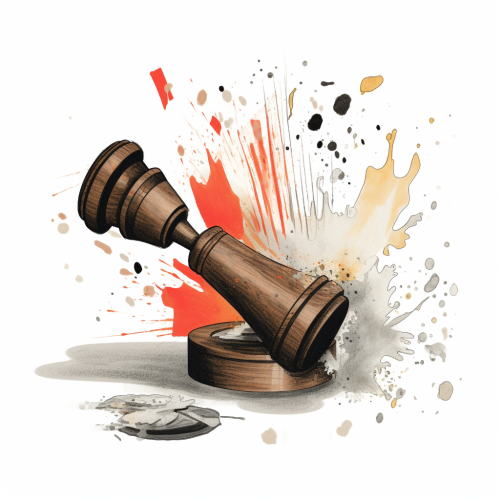 the judge's gavel smashes the Google logo. The logo is falling apart. The gavel looks plausible. Illustration. Crayon drawing. --ar 3:2 --v 5.0