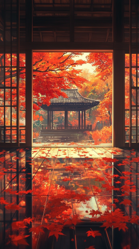 A tranquil Japanese temple in autumn with vivid red, orange, and yellow maple leaves surrounding the structure. The scene is seen from within a traditional wooden room with large open windows, reflecting the autumn colors on the polished floor, in the style of Makoto Shinkai. The lighting is warm and radiant, capturing the peaceful yet vibrant essence of autumn. Highly detailed, soft shading, realistic yet anime-inspired. --ar 9:16 --v 6.1