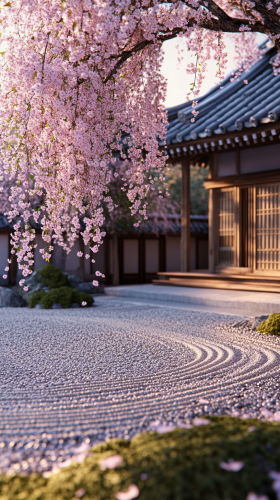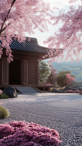An elegant Japanese Zen temple surrounded by a carefully maintained garden, showcasing a grand weeping cherry blossom tree in vivid pink bloom. The tree stands beside the traditional temple building with its wooden structure and large, open veranda, framed by mountains in the background. The raked gravel garden features precise, flowing patterns that reflect a sense of inner peace. Soft morning light filters through the blossoms, casting gentle shadows and enhancing the spiritual ambiance of the scene. Photorealistic, highly detailed, 8K resolution --ar 9:16 --v 6.1 --style raw
