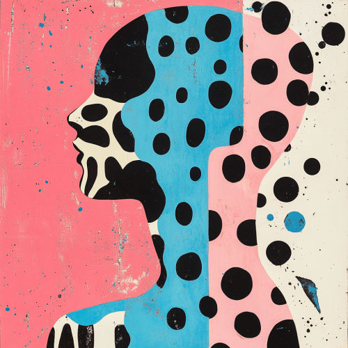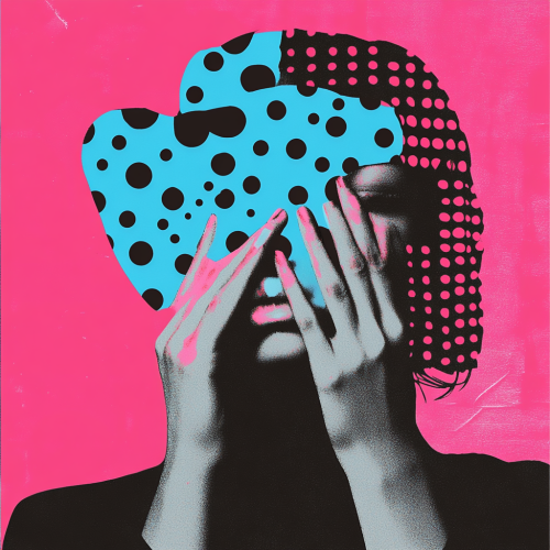 generate a simplistic minimalist collage, inspired by pop art and kusama. the subject is: mental health struggles. vibrant flat three tone colors with a color palette of: pink and blue and black. multilayered, retro, creative and artistic --v 6.1