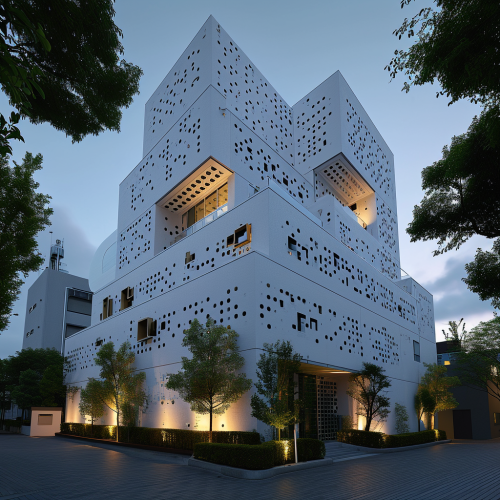 minimal contemporary parametric japanese white building in evening Tokyo hint of yayoi kusama style --v 6.0