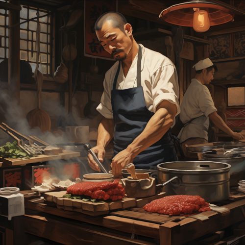 japanese shinto raijin working in an izakaya kitchen, traditional art