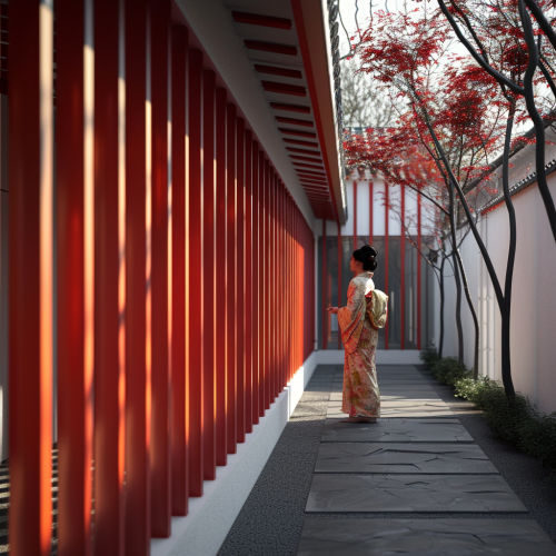 a courtyard contemporary japanese temple building, asian woman in kimono walking by the white red parametric timber wall --v 6.0