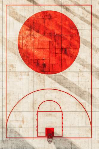 A minimalist full basketball court where the entire surface is designed as the Japanese flag. The court features a clean white floor as the base, with a large, bold red circle perfectly centered, representing the red sun from Japan’s flag. The red sun dominates the midcourt, blending seamlessly with deep red court lines in a sleek, minimalist style. The design embraces simplicity, with no extra patterns, creating a bold, impactful look. The court has a polished, semi-gloss finish, reflecting light elegantly, giving it a modern and sleek aesthetic --ar 2:3 --s 250 --v 6.1