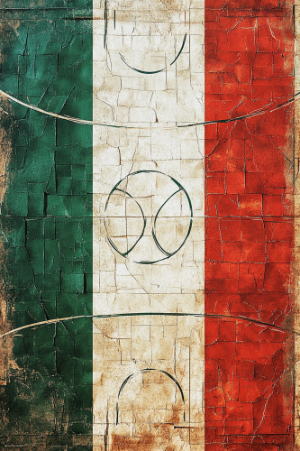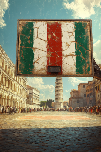 Centered, wide-angle view of a realistic half-court basketball scene. The backboard is a rectangular, realistic depiction of the Italian flag with green, white, and red vertical stripes. The court features accurate lines, a single basketball net, and a clean surface. The background includes the Colosseum, Leaning Tower of Pisa, and Venetian canals, along with traditional Italian architecture like a Roman arch. People in stylish Italian clothing walk around, enhancing the cultural scene. Minimalist realism, clear and detailed depiction. --ar 2:3 --s 250 --v 6.1