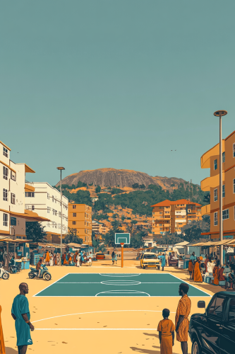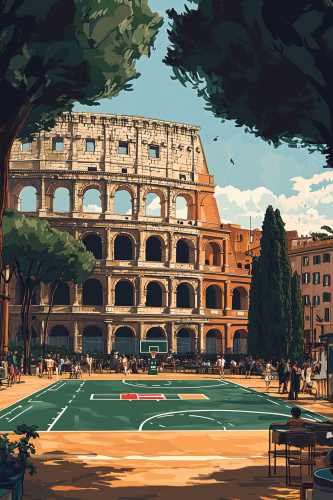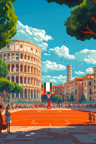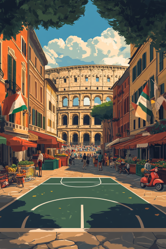 Minimalist realism illustration of a basketball court set in front of the Colosseum in Rome. The court features clean green, white, and red lines representing the Italian flag, with the backboard prominently displaying the tricolore flag in accurate vertical stripes (green, white, and red from left to right). The scene is framed by olive trees and Roman statues, with locals walking around and interacting--some sipping espresso at nearby tables, others chatting by a Vespa, reflecting the modern Italian lifestyle. The locals have distinct Mediterranean features, such as olive skin tones and dark hair, dressed in casual, stylish clothing. The Colosseum’s arches tower in the background, with soft Mediterranean sunlight casting warm shadows. The composition highlights the cultural atmosphere, backboard, and architecture without any players on the court. The overall style is minimalist realism, with clean lines and muted, natural colors, focusing on the harmony between culture and sport --ar 2:3 --s 250 --v 6.1