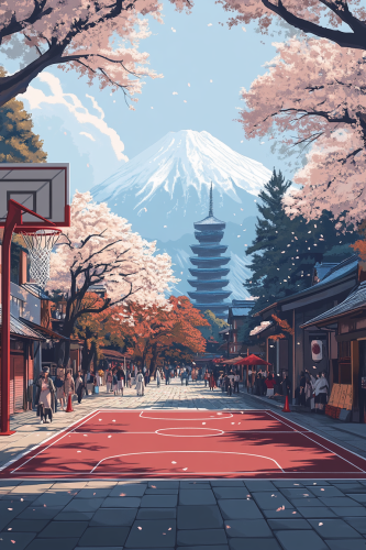 A stunning minimalist realism and photorealistic illustration of a half basketball court in the foreground, with an accurately placed NBA-style hoop and net, sized and positioned correctly on the court. The court is accented in the colors of the Japanese flag: red (#BC002D) and white (#FFFFFF). Surrounding the court, a beautiful display of Japanese culture unfolds. Lush cherry blossom trees in full bloom, with soft pink petals (#FFB7C5) gently falling, line the edges of the court. TraditionalJapanese pagodas** andwooden temples** blend with themodern Tokyo skyline**, where towering skyscrapers and neon signs add energy to the scene. In the foreground, sharply detailed locals in vibrantkimonos** andyukatas** interact with the environment--some playing traditional drums, others shopping atfestival stalls** offering street food likeyakitori** andtakoyaki**. The smooth stone walkways reflect Japan's authentic streets, while redtorii gates** and stone lanterns near the court evoke spiritual harmony. Mount Fuji stands majestic in the background, contrasting with the urban energy. The midday sunlight casts realistic shadows, enhancing every detail, while the vibrant mix oftraditional and modern** Japan brings the scene to life. --ar 2:3 --v 6.1 --s 250