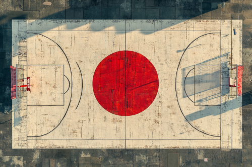 A basketball court designed as the full Japanese flag, with the entire surface covered by a pristine white background and a large, bold red circle in the center, representing the red sun. The basketball court lines are sharp, crisp, and minimalistic, blending seamlessly into the flag design. The court lines, including the three-point arc and key, are realistic and sleek in a subtle deep red, ensuring they stand out but do not overpower the flag. The design is clean and modern, with a polished, semi-gloss finish, enhancing the minimalist aesthetic. The overall look is simple yet striking, with an elegant balance between traditional flag elements and functional court design --ar 2:3 --s 250 --v 6.1