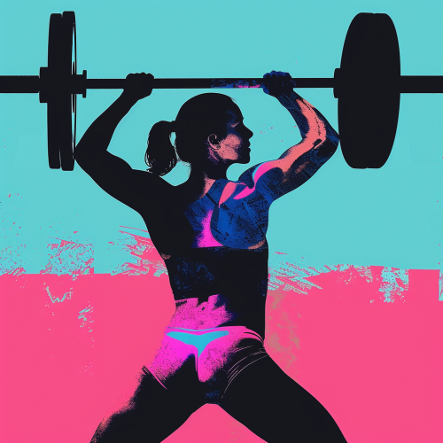 generate a simplistic minimalist collage, inspired by pop art and kusama. the subject is: a female olympic weight lifter. vibrant flat three tone colors with a color palette of: pink and blue and black. multilayered, retro, creative and artistic --v 6.1