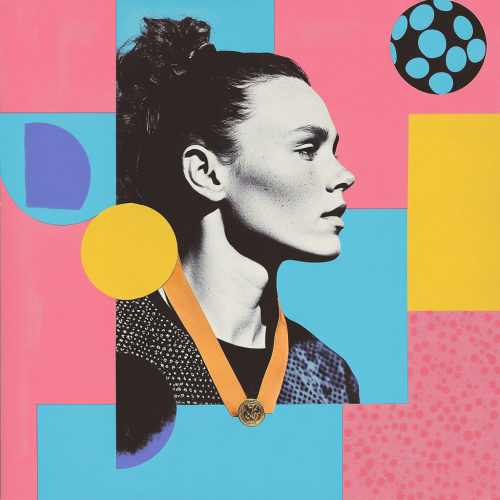 generate a simplistic minimalist collage, inspired by pop art and kusama. the subject is: quinn from the canadian womens soccer team wearing a gold olympic medal. vibrant flat three tone colors with a color palette of: pink and blue and black. multilayered, retro, creative and artistic --v 6.1