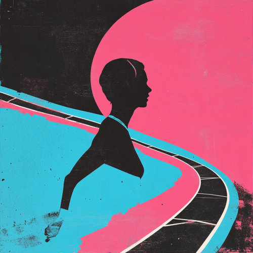 generate a simplistic minimalist collage, inspired by pop art and kusama. the subject is: a female athlete with short masculine hair running on a track circuit. vibrant flat three tone colors with a color palette of: pink and blue and black. multilayered, retro, creative and artistic --v 6.1
