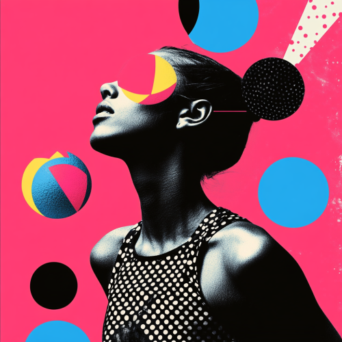 generate a simplistic minimalist collage, inspired by pop art and kusama. the subject is: a female track athlete with short masculine hair. vibrant flat three tone colors with a color palette of: pink and blue and black. multilayered, retro, creative and artistic --v 6.1
