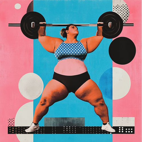 generate a simplistic minimalist collage, inspired by pop art and kusama. the subject is: a plus size female olympic weight lifter. vibrant flat three tone colors with a color palette of: pink and blue and black. multilayered, retro, creative and artistic --v 6.1