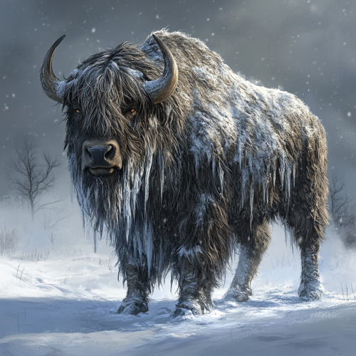 Fantasy Art: A beast that is a cross between a horse and a bison, the face of a bison but the back looks like a horse without any fur, standing slightly shorter than a horse, its muscular frame is covered in thick, dense fur, ranging from dark brown to grey, that shields it from the coldest winds and biting snow. Its fur is often matted with ice, giving it a rugged, weathered appearance.
